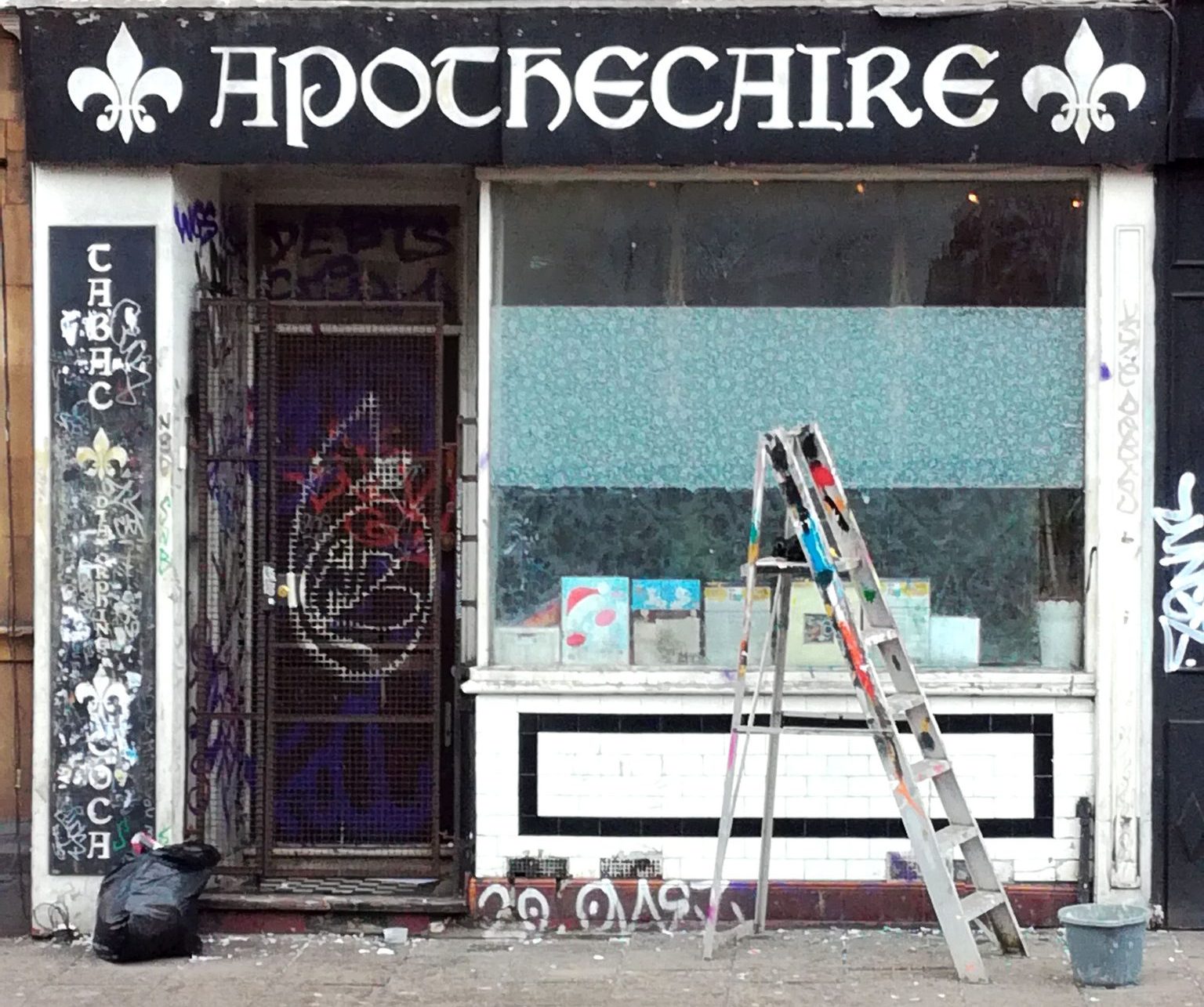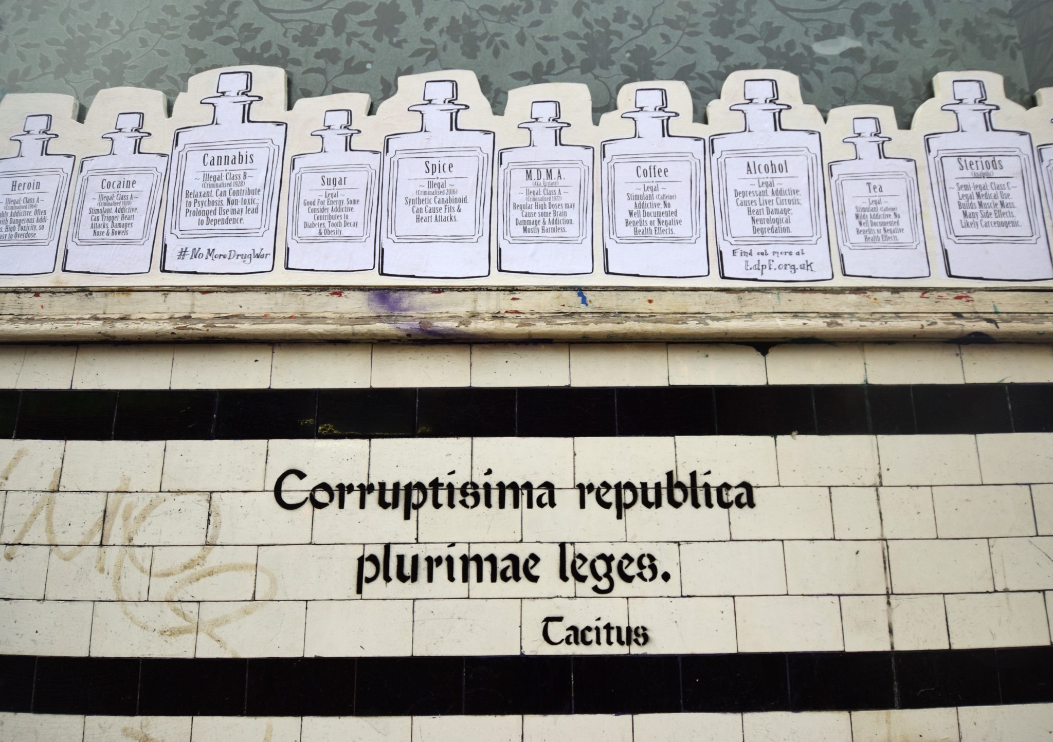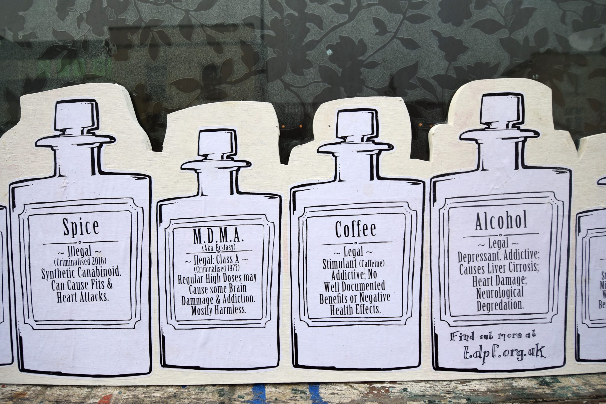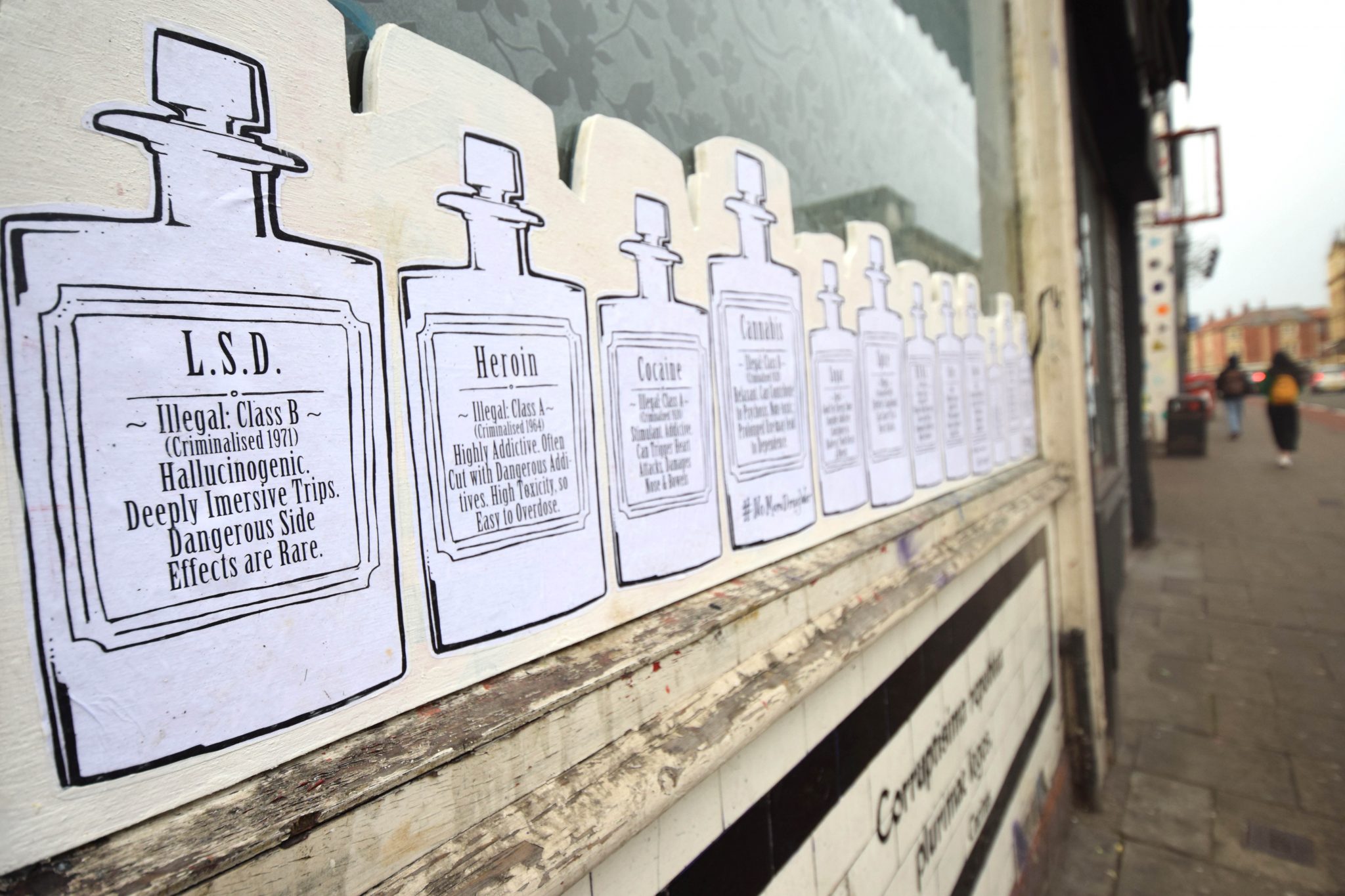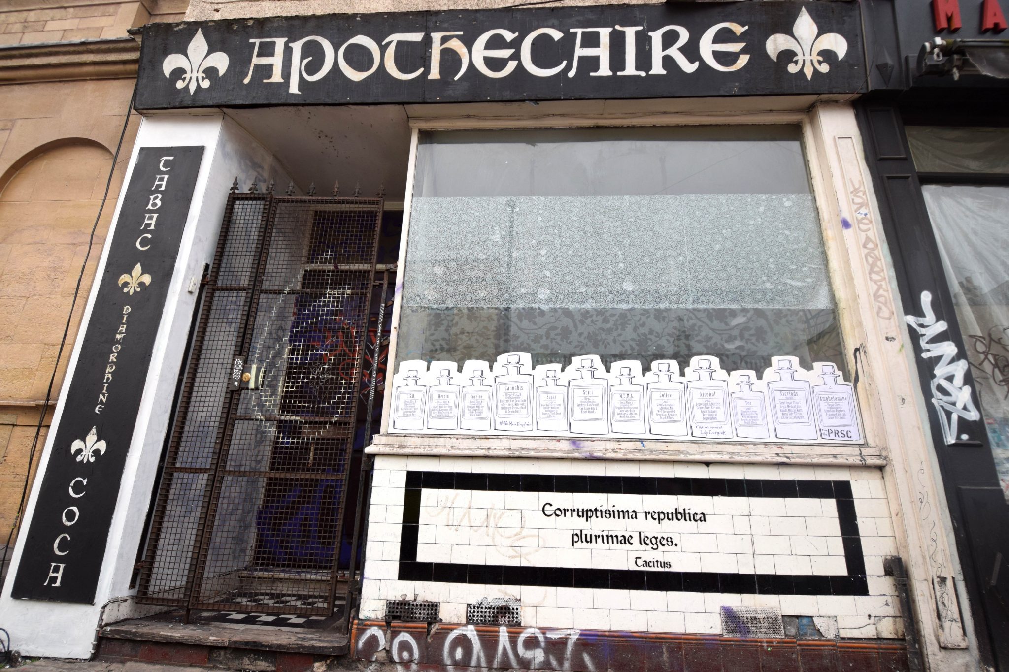 The area of Stokes Croft is particularly challenged by issues over drugs. Starting from the concept of the ‘Apothecary‘, the place where you would get medicinal supplies, the collection of legal and illegal drugs addresses the arcane and bizarre drug laws that don’t make sense.