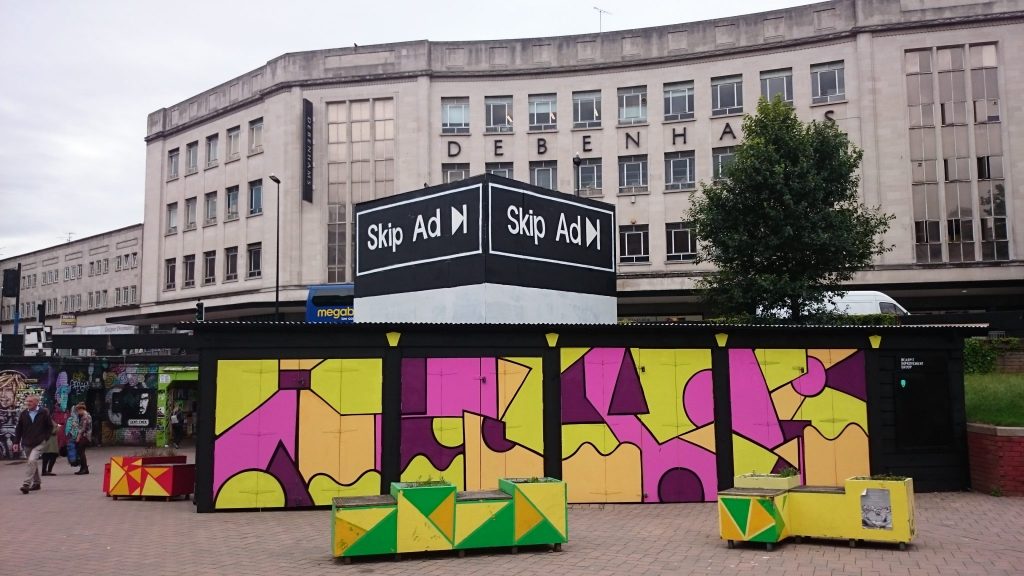 An exercise in amplifying community voice in a city centre environment flooded with corporate messaging. Installed by PRSC in 2013, The Bearpit Cube was torn down by Bristol Waste in 2018.