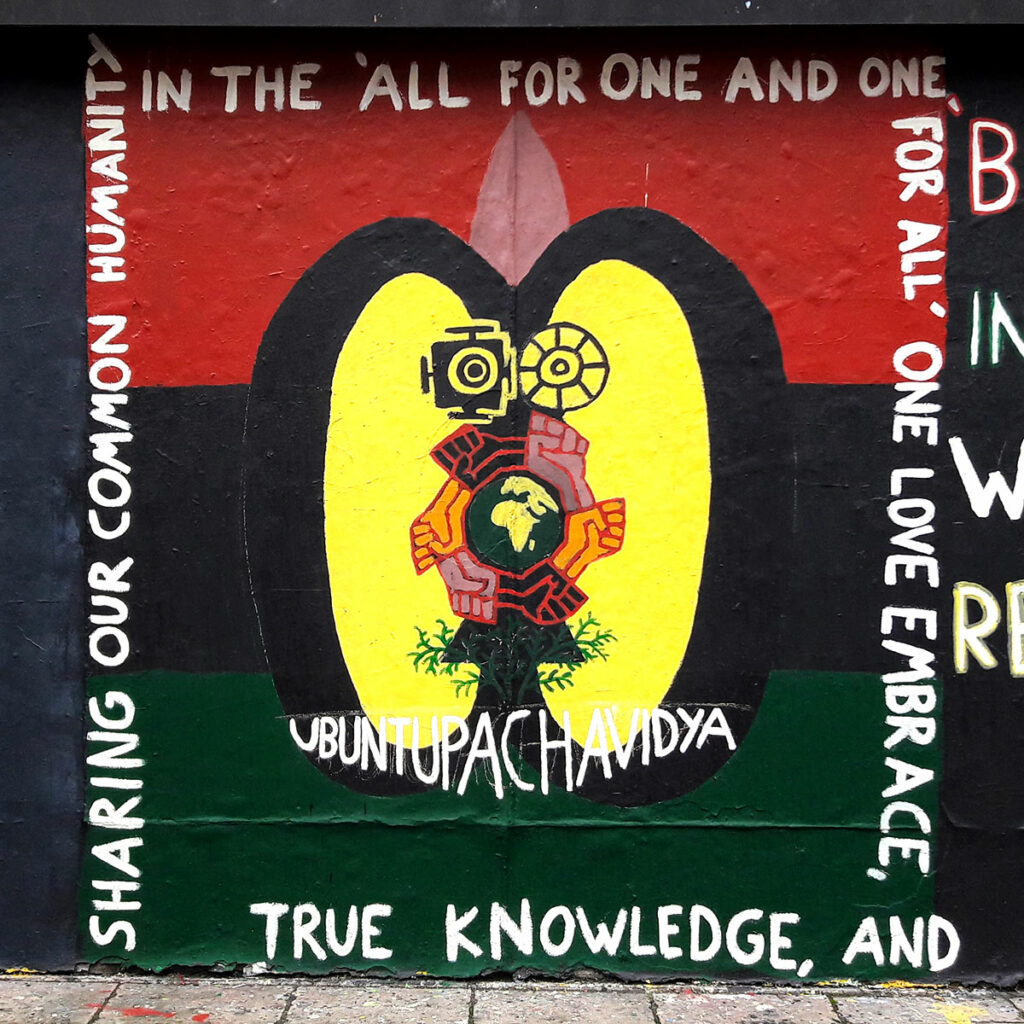 1. The background is the red, black and green of the Pan-Afrikan Flag with the symbol of UUBUNTUPACHAVIDYA painted on top, which is a Global Justice conceptual framework of Intercultural Communion for the Internationalist Solidarity Defence of human, peoples’ and Mother Earth’s Rights.