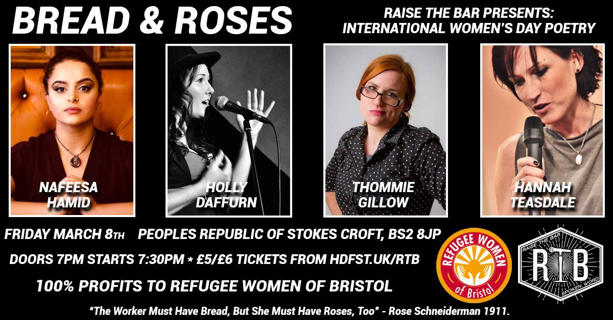 Raise the Bar Presents: BREAD & ROSES – An International Women’s Day poetry fundraiser celebrating the strength and achievements of women and folks of other oppressed genders and raising money for Refugee Women of Bristol.