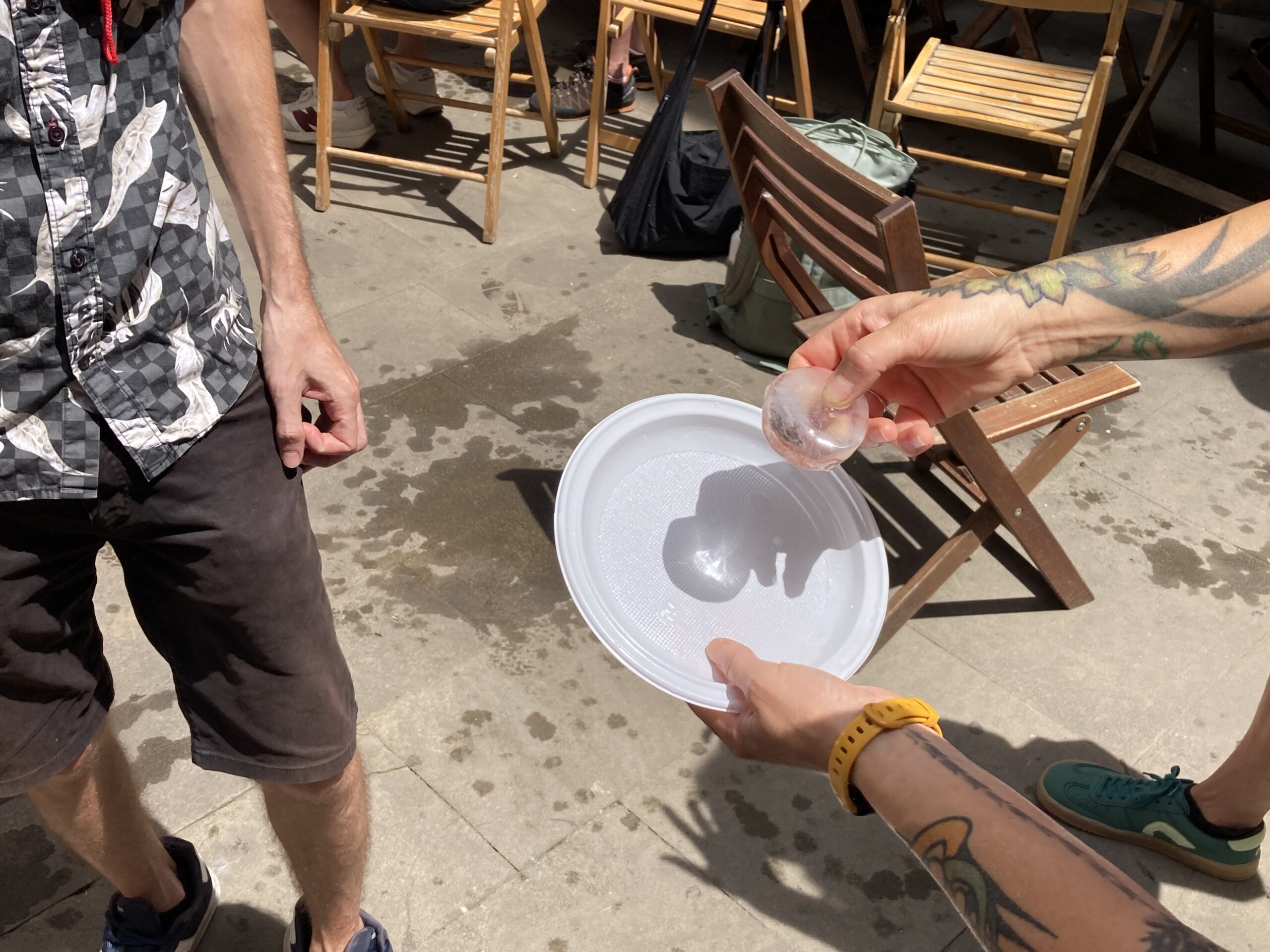 The brevity of making ice lenses gave the second workshop all of its charm. Armed with a plate and two hands, participants rounded out the ice into a circular form. Held to the sun, the ice imitated a focused lens. However, moments later, they were left with puddled paper plates and drippy hands. Their ice, sweat, and tears vaporised by the sun. A humming banter broke out and it rose like hot air above the enclosed façades, while below mousy smiles scurried amidst the crowd. The spirit of experimentation was at work and everyone was loving it. It is easy to compare Quinnell’s workshop to a performance rather than a course, where jester-like antics and intermediate harmonica tunes turn the activities into a theatre musical. Bravo!