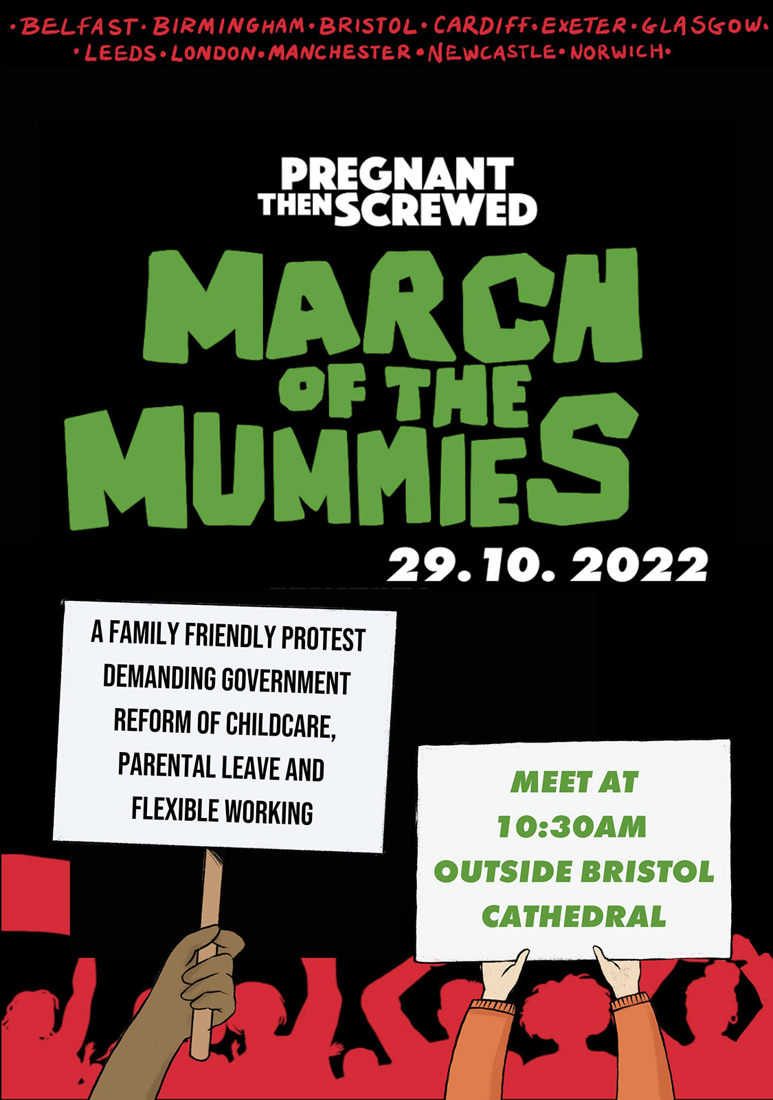 The protest carriers three demands good quality affordable childcare for all children, flexible working as the default, and ring fenced, properly paid parental leave for all parents.