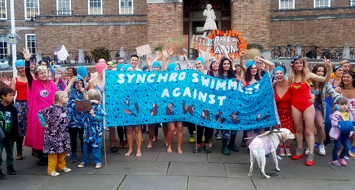 As this unfolded inside City Hall, outside on College Green several dozen protesters dressed in swimming costumes held a mini-rave in what has to be Bristol’s most upbeat protest of the year so far (and certainly the only one to feature speedos).