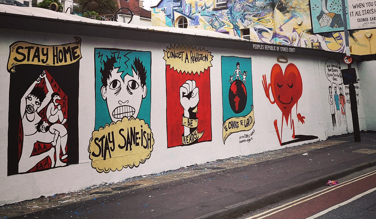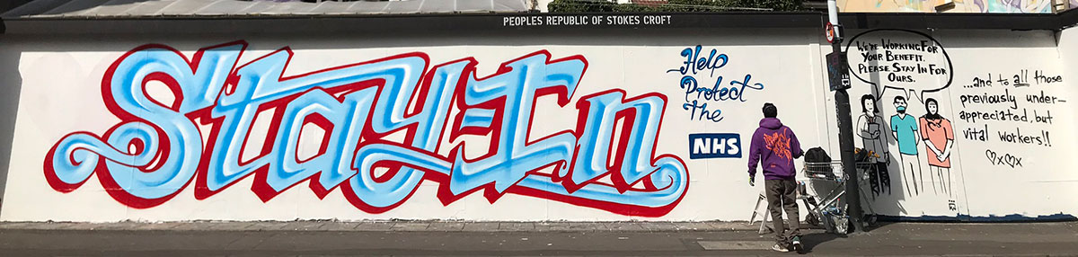 We chose ‘Stay In’ rather than the more widely used ‘stay home’ message, reflecting the high number of people with no homes to go to around Stokes Croft.