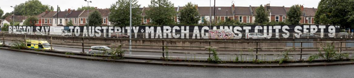 Artwork designed by the People’s Republic of Stokes Croft and painted by graffiti artists Object and Deamz, the pieces call on people to turn out and fight against austerity.