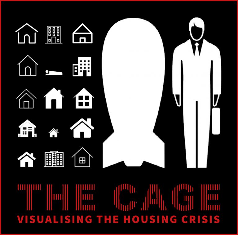 The installation was produced during a project called THE CAGE: Visualising the Housing Crisis, and is made up of archive and contemporary photographs, statistics and facts focussing on the ever deepening issues facing the UK’s housing situation.