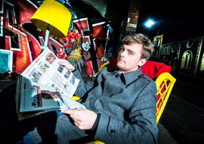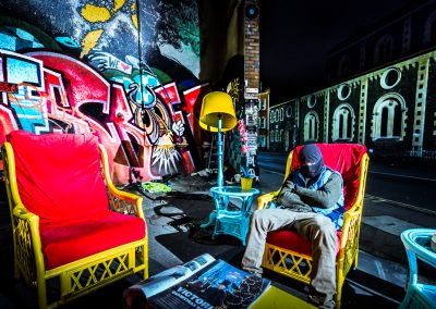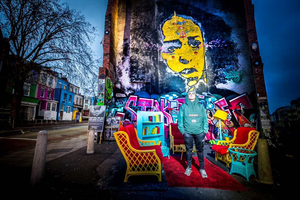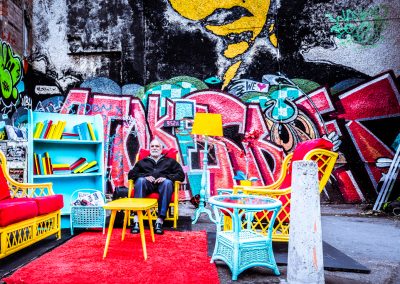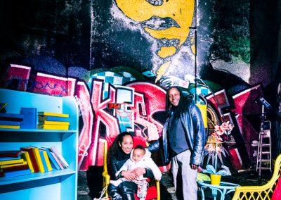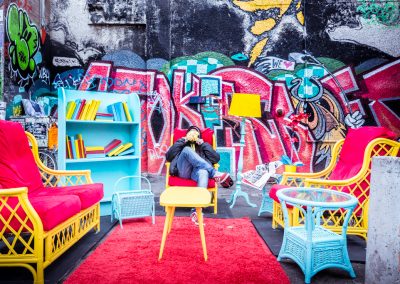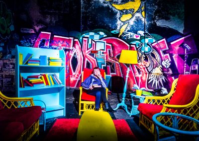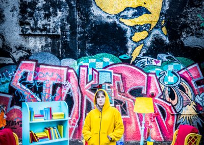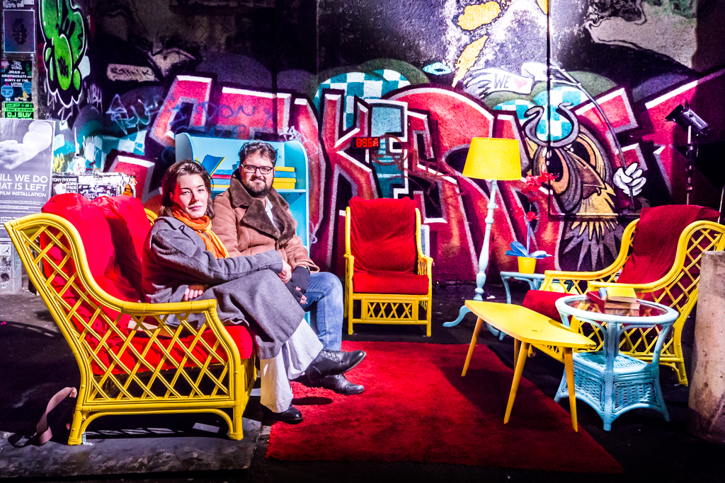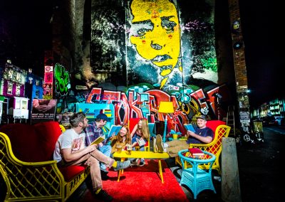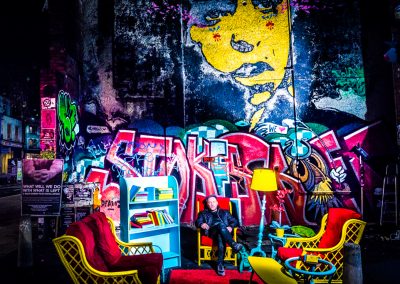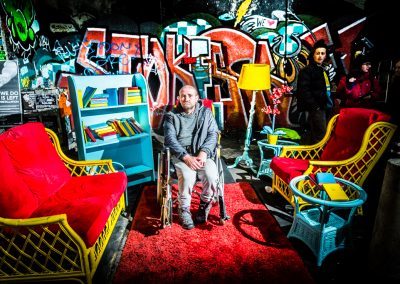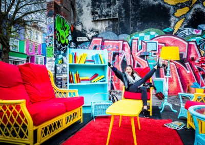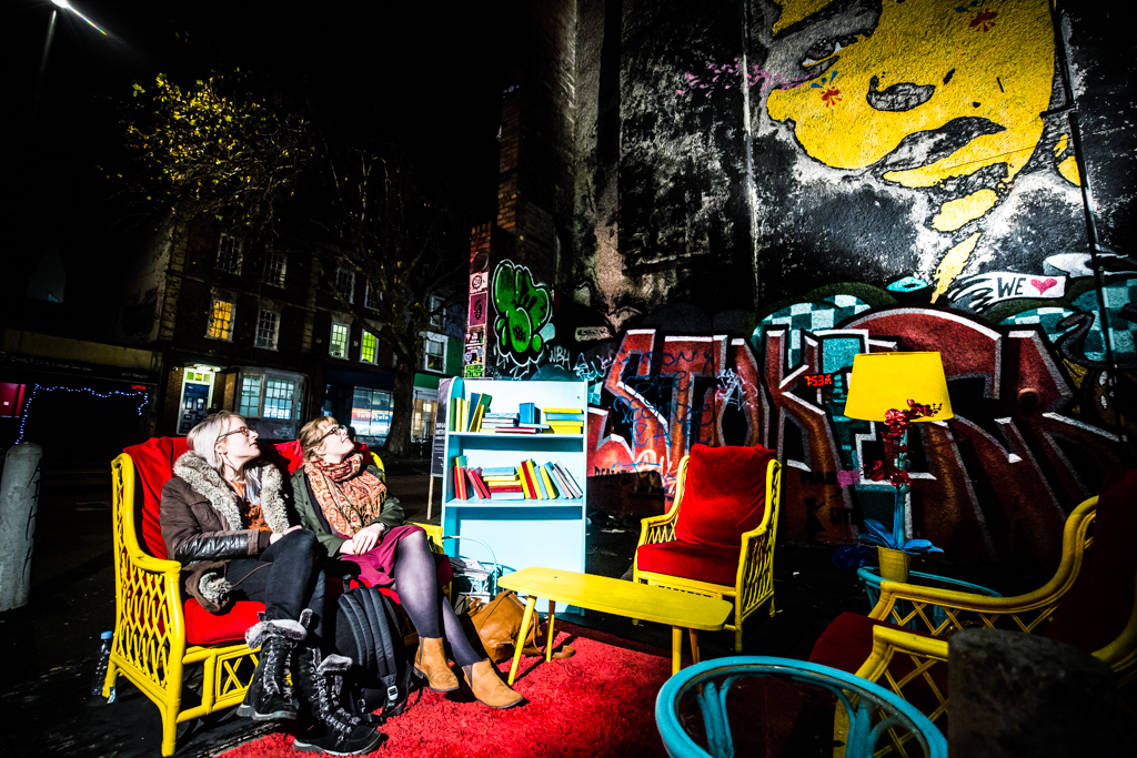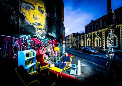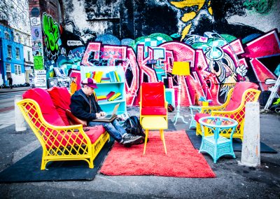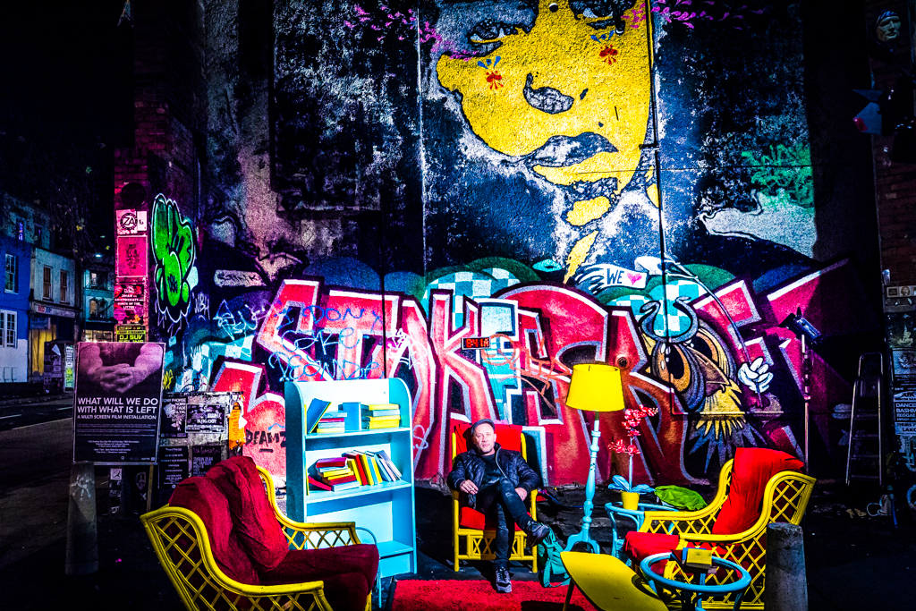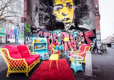 For the opening of our exhibition 24H OUR CITY – The People Of The Croft photographer Claudio Ahlers and installation artist Sarah Middleton invited visitors to re-live the 24-hours they spend capturing photographic portraits of passers-by, artists, residents, activists, tourists, homeless people, professionals – the people of the Croft – in a colourful living room set in front of the iconic mural at the corner of City Road and Stokes.
