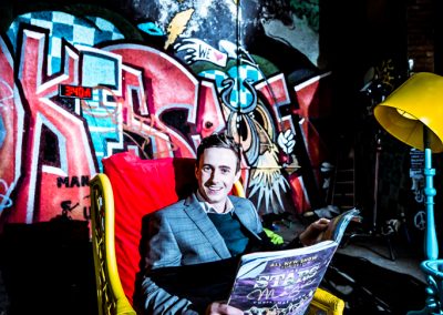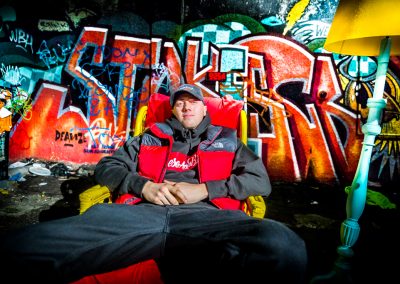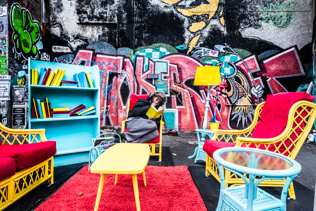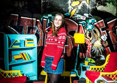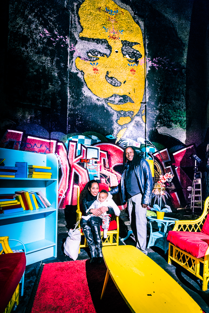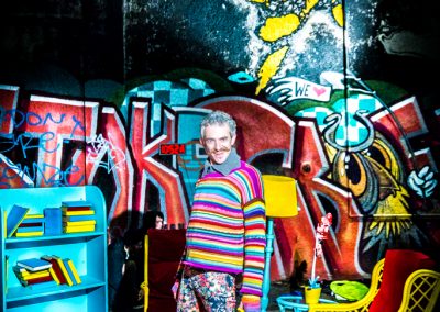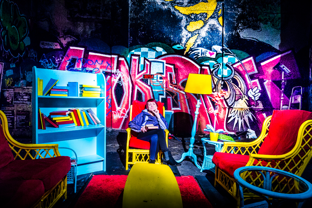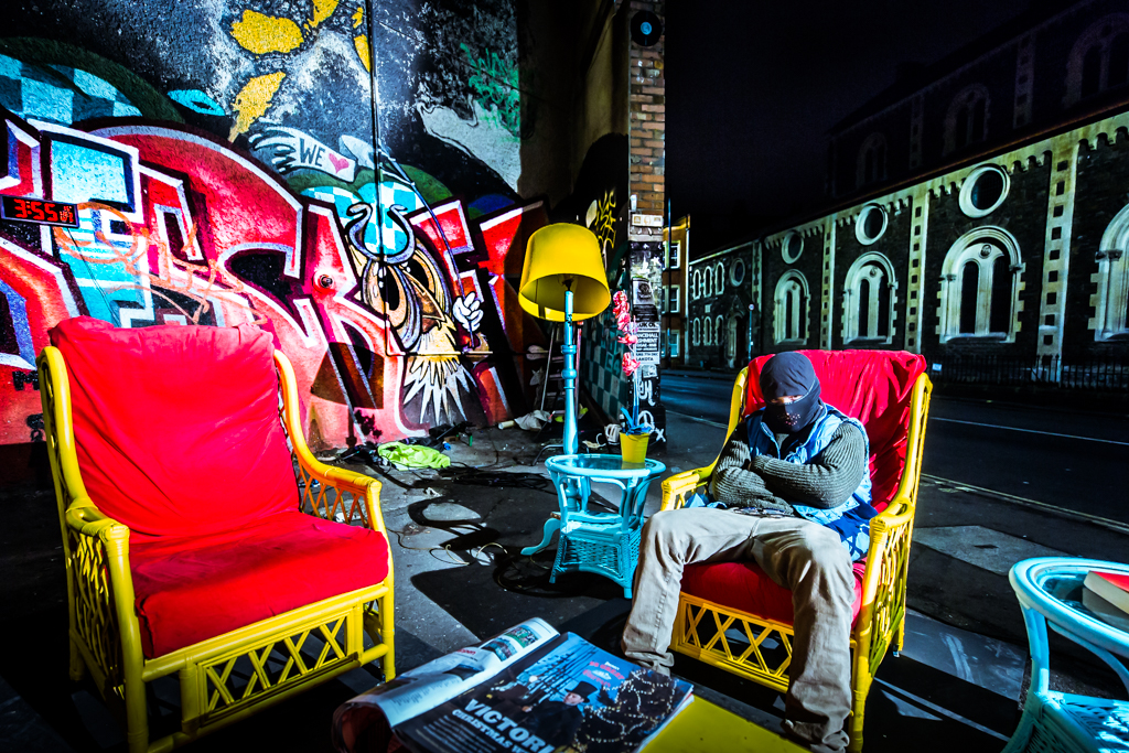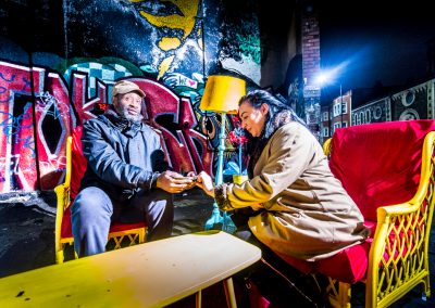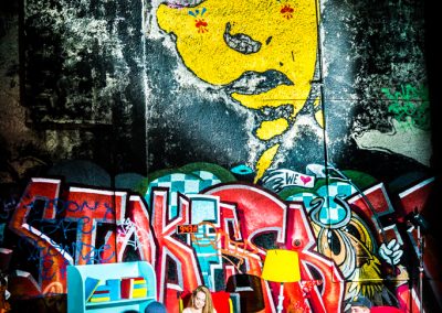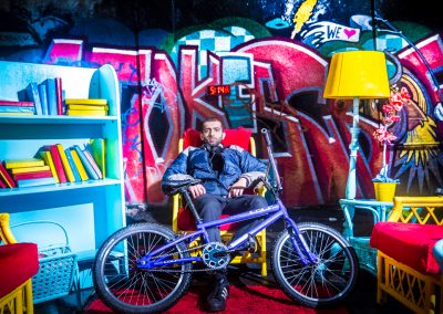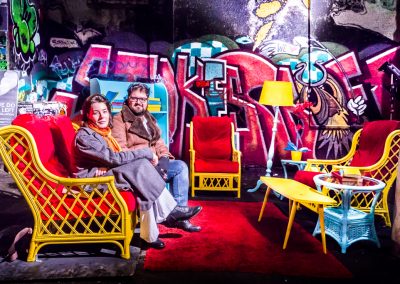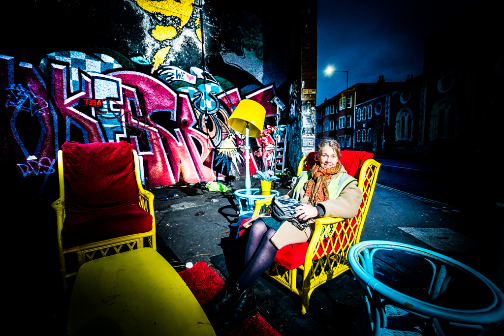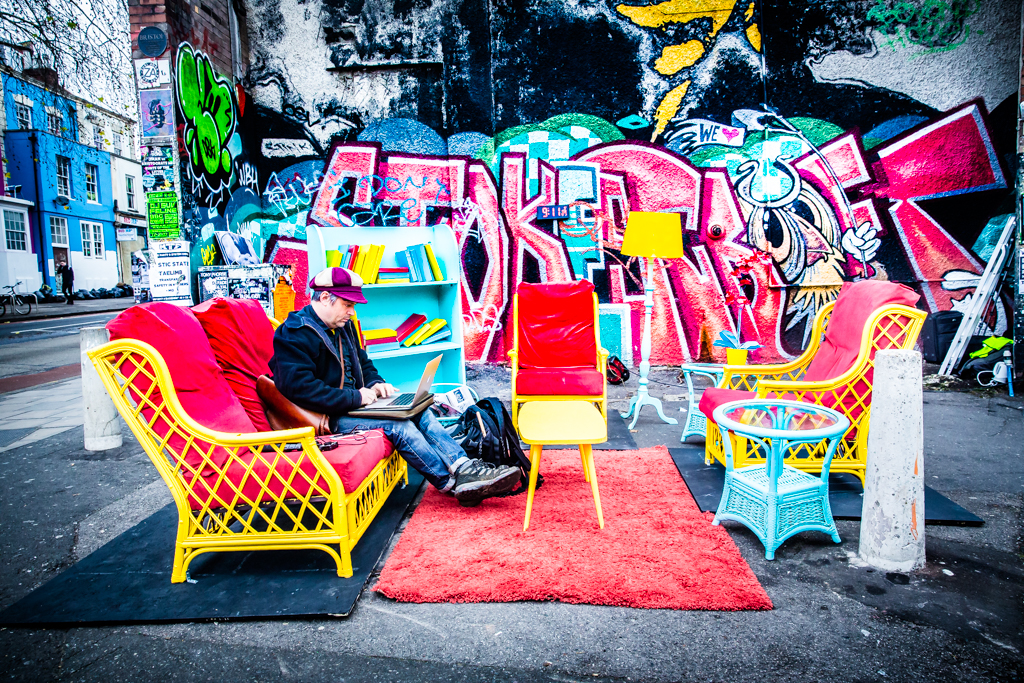 For the opening of our exhibition 24H OUR CITY – The People Of The Croft photographer Claudio Ahlers and installation artist Sarah Middleton invited visitors to re-live the 24-hours they spend capturing photographic portraits of passers-by, artists, residents, activists, tourists, homeless people, professionals – the people of the Croft – in a colourful living room set in front of the iconic mural at the corner of City Road and Stokes.