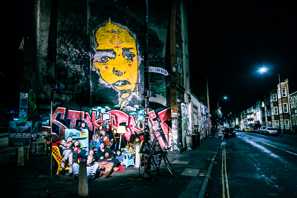 For one night and one day only the entire set of photographs from 24H OUR CITY was projected in real-time in the PRSC gallery while we celebrated the people who make Stokes Croft the extraordinary place that it is with sets from local musicians, performance artists, acrobats and poets.