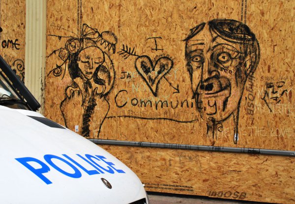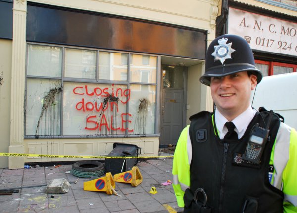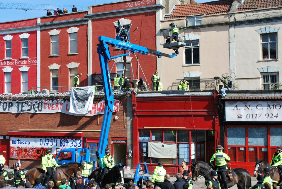 In 2010, Tesco Plc announced their intention to move into the Stokes Croft/Montpelier area in Central Bristol. Tesco gained planning permission to open their store without anybody realising their intention. Planning permission was applied for by a third party. The legal minimum consultation took place. One A4 sign on a lamp post, and one small ad in The local paper. Fifty consultation letters were sent out, and no objections were received: Indeed no replies whatsoever were received. When it emerged that Tesco had gained permission to open a store in this underhand manner, 2,500 objections were sent to our Council. Surveys were conducted amongst local people. The results were overwhelming. This area of the City did not want a Tesco store. Despite a diligent and vocal campaign from the local populace, our City Council lacked the courage to deny Tesco Plc the right to open in an area defined by its local character. Stokes Croft and Montpelier are both Conservation areas, whose status is defined by its independence of character. Certain groups squatted the building and, in March 2010, those squatters were evicted by bailiffs. The Police stood between the bailiffs as they did their work. Resentment in the community was building.