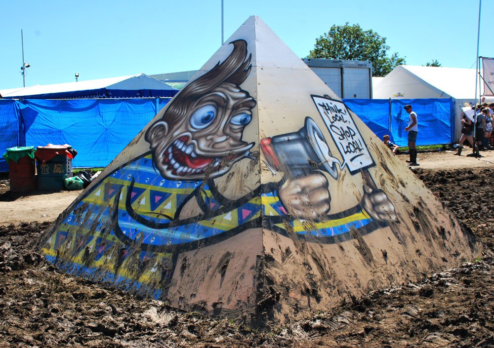 The Think Local Boycott Tesco Campaign had a presence at Glastonbury. One of the four pyramids in the Dance Villages was painted by Bristol’s Finest, carrying the message to the gathered hordes.
