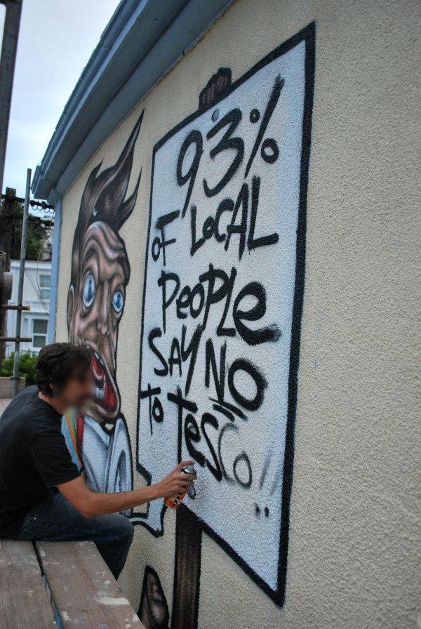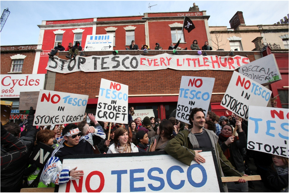However, if Tesco does open in Stokes Croft, the battle is not over. Stokes Croft is our Cultural Quarter: an area defined by its local culture, and by the confluence of people with radical ideas. If Tesco decide to open, with an overwhelming local opposition, then we must ensure that Tesco, and the devious methods employed by Tesco, do not prosper. In order to do this it seems appropriate to launch a measured response. The issues that confront Stokes Croft apply globally. Therefore, the No Tesco campaign must become the “Boycott Tesco” campaign, publicising the unsustainable methods and business practices, encouraging locals everywhere to back their local food suppliers. At the same time we must work to offer alternative models for food sourcing, for ourselves, and for everybody.