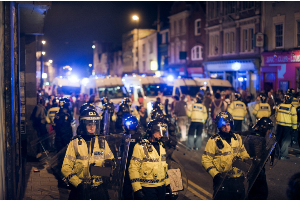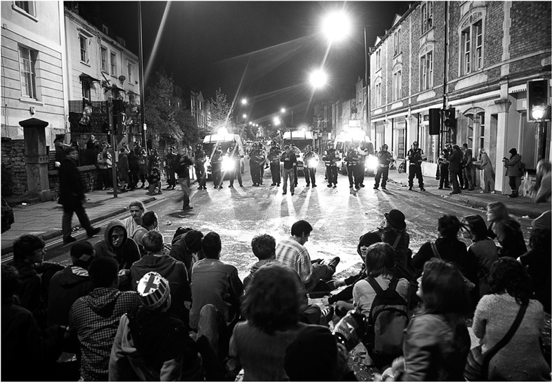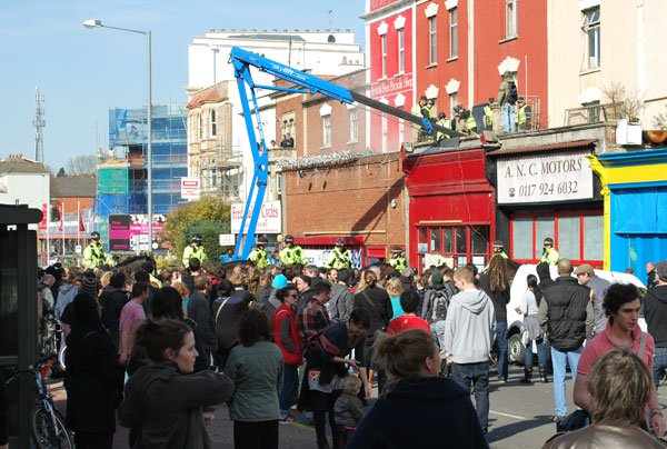 According to Simon Hughes, local beat officer, a fire bomb was seen/filmed by a Tesco security guard on the Thursday before the Easter Bank holiday at the Telepathic Heights squat opposite. The decision was taken to raid the squat around 8.30pm 0n Thursday evening, with Police wearing protective clothing. Back up Riot police were waiting in the wings. The squat was busted, things got out of hand. A riot took place. 160 riot police were on the streets of Stokes Croft.