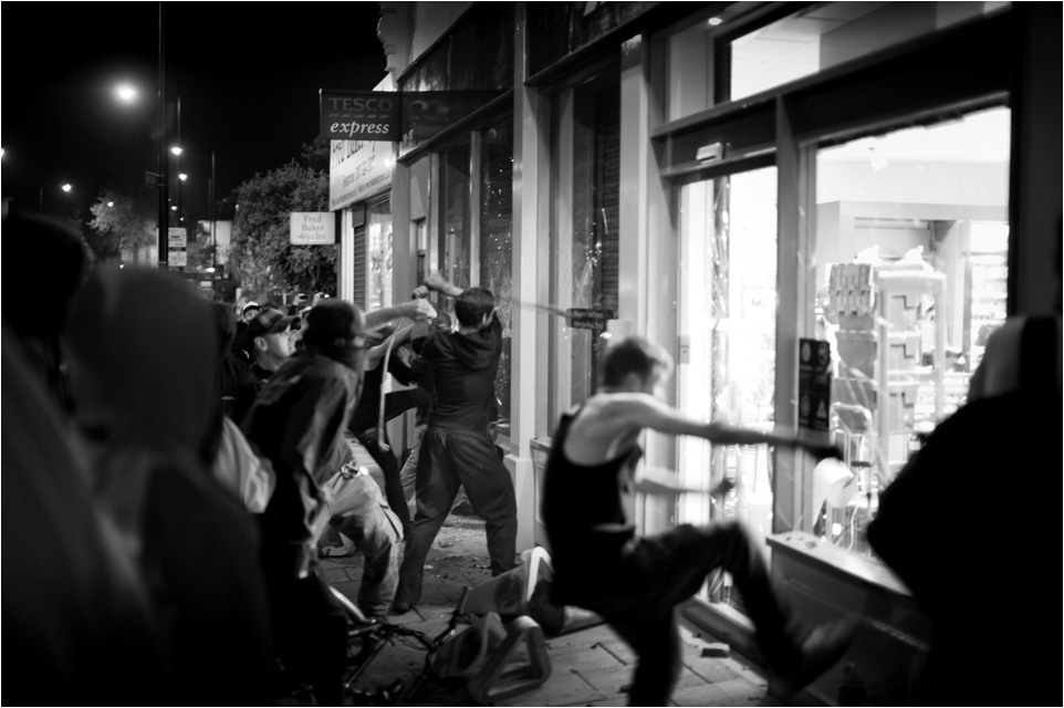 Towards the end of the evening, the Tesco shopfront was trashed.