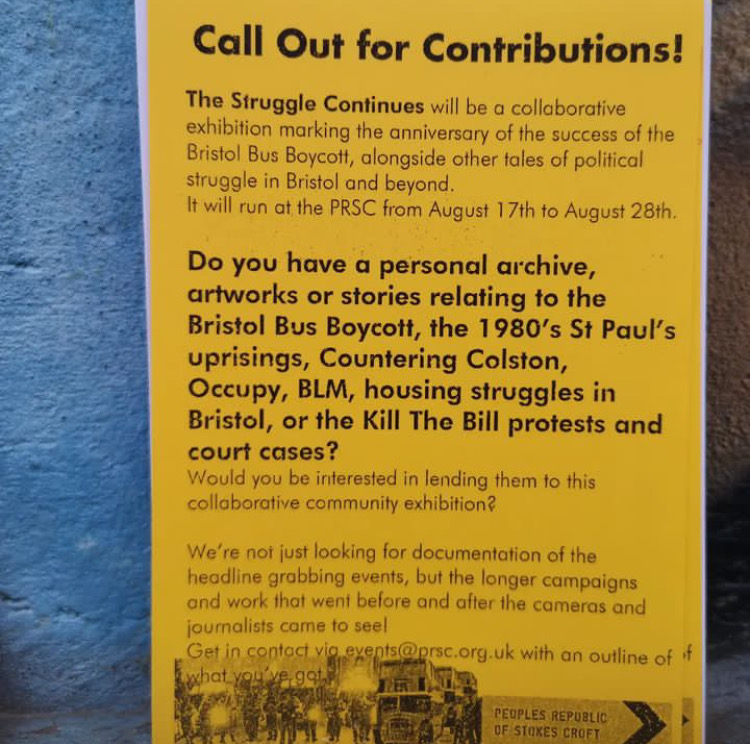 Do you have a personal archive, artworks or stories relating to the Bristol Bus Boycott, the 1980s St Pauls uprisings, Countering Colston, Occupy, BLM, housing struggles in Bristol, or the Kill The Bill protests and court cases?