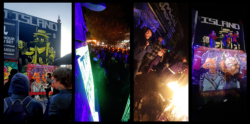 Saturday saw a party on Turbo Island, just days before the fateful auction scheduled for 5:30 this evening. The party saw a lush new paint job on Turbo from Rowdy, Ryder and Dazcat, the Free Shop, food and some of the BASE Infoshop out alongside some acoustic acts, after which people took to the decks on the Riggy Stardust sound system. There was an intermission for a keyboard piece too. And of course, a pallet fire, burning late into the morning.