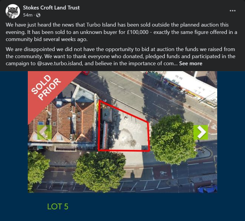 Until moments ago we were still crossing our fingers and toes that Stokes Croft Land Trust will be able to bid, and that maybe the strength of community feeling, along with the legal measures we’ve taken to make it less appealing, will have put off more commercially minded buyers. It turns out the auction has been cancelled, and according to a statement from SCLT it was sold to someone privately, for the same amount mooted as a possible off-auction price for SCLT. Even if someone mistakenly thinks they can take it away form the community who have used it for many decades, they will inevitably face fierce community resistance, and maybe someone with a heart of gold and deep, deep pockets will buy it to hand back to the community. What I’m saying is that far from being the end of Turbo Island, this is just the start of a new phase. Turbo has changed in many ways, for many reasons, over the years, and will keep changing. We just want to make sure that these changes don’t end up taking away this vital community space, especially from those who need it most.