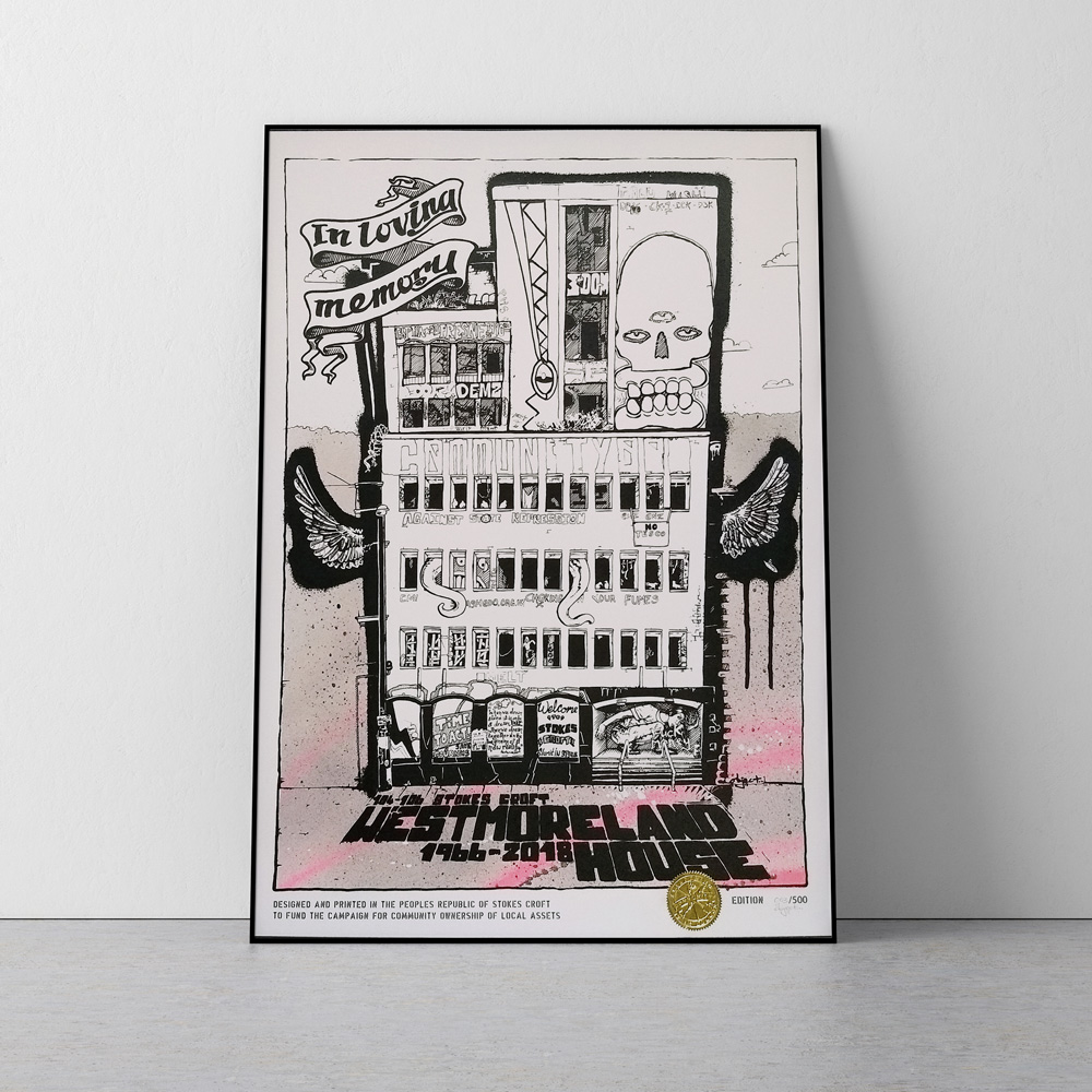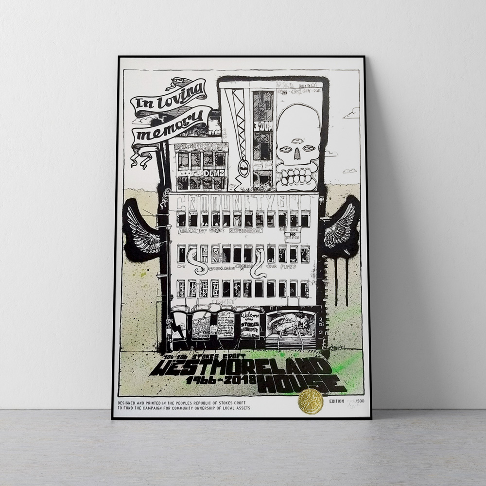 This print is the first step in helping Stokes Croft take back control from the forces of gentrification, as the money raised from sales of the print will help fund the setting up of a Stokes Croft Land Trust (SCLT).