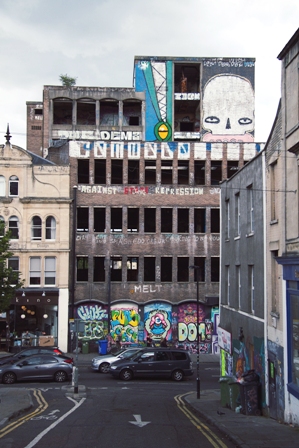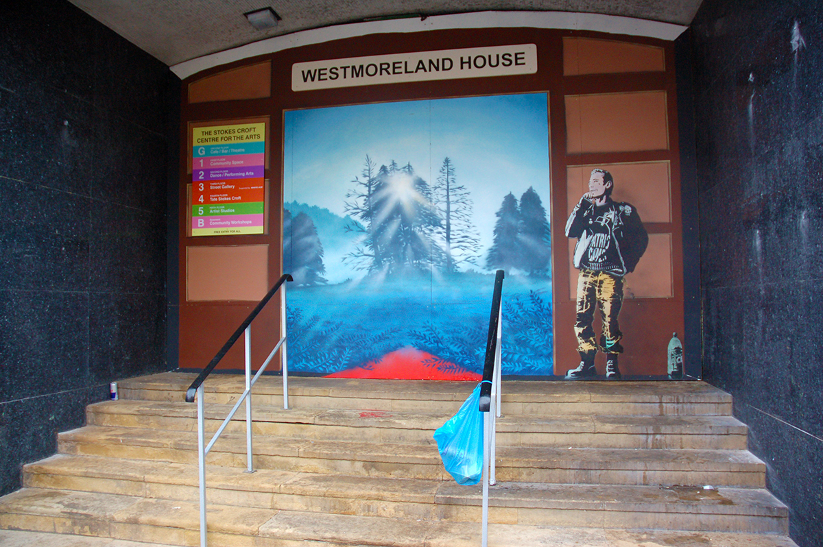 As an empty shell, for decades Westmoreland House was a cypher for whatever people hoped Stokes Croft would be, even empty and crumbling as it was for so long. When the Burning Candy crew painted their massive Sweet Toof skull and Rowdy crocodile the building became iconic again, and as so often with graffiti the interpretation was divisive – whilst some saw the adornment as evidence of continued decline and neglect, to many others it announced the rebellious spirit of the Croft for all to see.