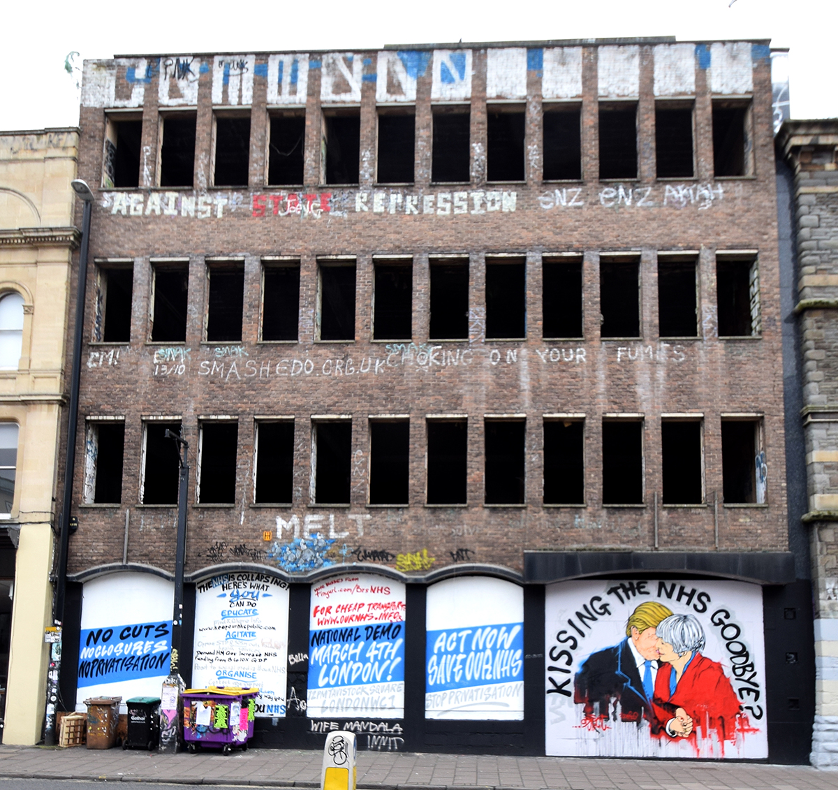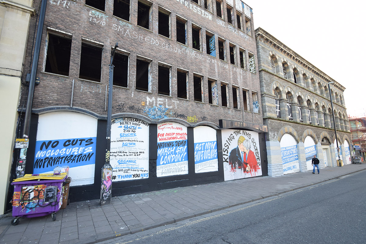 Dreams of Westmoreland’s potential as a community space and arts centre: Stokes Croft Centre for the Arts inspired the development of Hamilton House into the thriving community arts space it was. It’s massive presence on the street has been used as a canvas (especially after the PRSC installed boards in all the windows, making them frames for artworks), and to promote the NHS, fight (the now defunct) TTIP, and a huge ‘Free Palestine’ piece. Even when it was derelict people lived, skated, painted, partied, loved, and yes, died in there. Over all those years of neglect it still represented potential to many of the people passing by, and now it’s gone, fenced off, in development, the potential has collapsed into another developer’s dream, where they’ve paid too much for the site to allow normal people to live there.