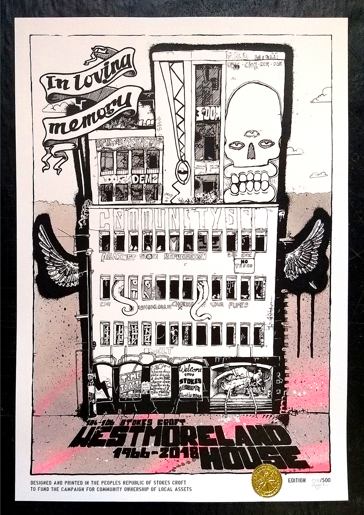 It shows the half-pipe people skated on the second floor; Filthy Luker’s inflatable tentacles which once emerged from the windows; memorials to Rafa and Punk Paul; the pigeons, the protest banners and the murals. Each hand pulled screen-print has a hand painted background in pink or green (skull or crock!), a gold foil embossed ‘community’ sigil, and is signed and numbered by object… the artist. The creation and sale of this print not only celebrates an icon, but all profits made go towards making the SCLT project happen.
